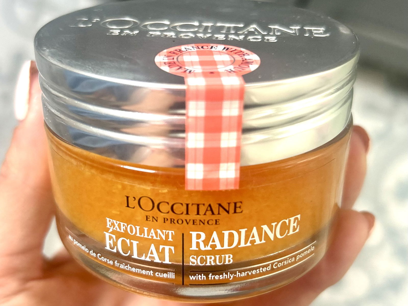 L’Occitane Radiance Scrub comes in a 75ml glass jar, screwed shut by a silver lid, with a cute red and white gingham tag, presumably as a nod to its ‘jam-like’ characteristics. It is described on the website as ‘a jam-like exfoliating mask that’s jam-packed with benefits.’ Also cute.