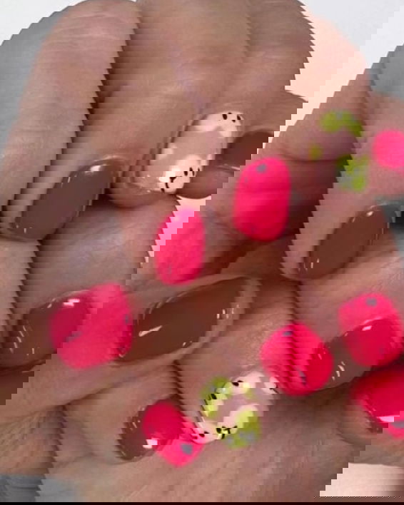 29. Pink and green smiley face nail design