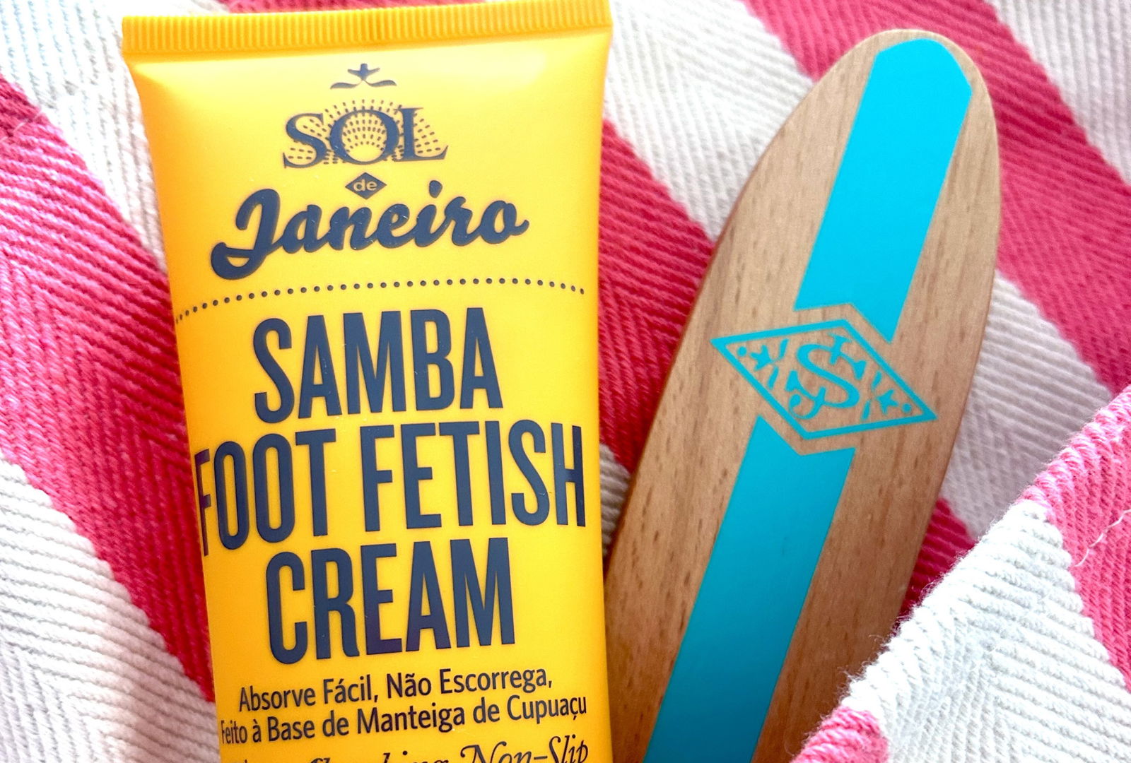 In the box you’ll find a 90ml tube of Samba Foot Fetish Cream and a pouch containing a small smoothing foot file, which is shaped like a little surfboard. The cream contains cupuacu butter, acai and conditioning coconut oil to help hydrate feet and make them smell holiday-fresh.
